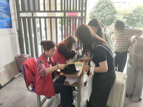 迎新现场,身着蓝色和红色马甲的志愿者们面带微笑,热忱欢迎学弟学妹们的到来,他们穿梭于咨询台、教学楼、宿舍楼、食堂等地,耐心地为新同学们提供引导、答疑、行李寄存与搬运、办理入学手续等服务。他们忙碌的身影让每一位报到的新生倍感温暖和亲切,极大地缓解了新生初入校园的紧张和焦虑感。