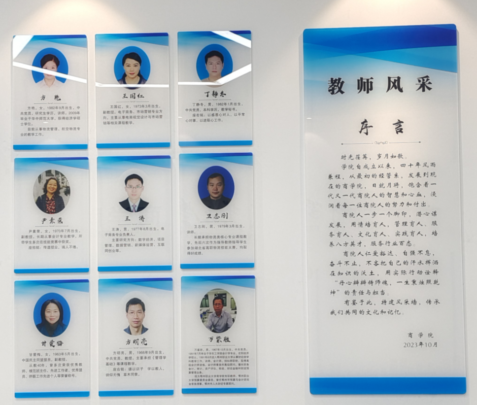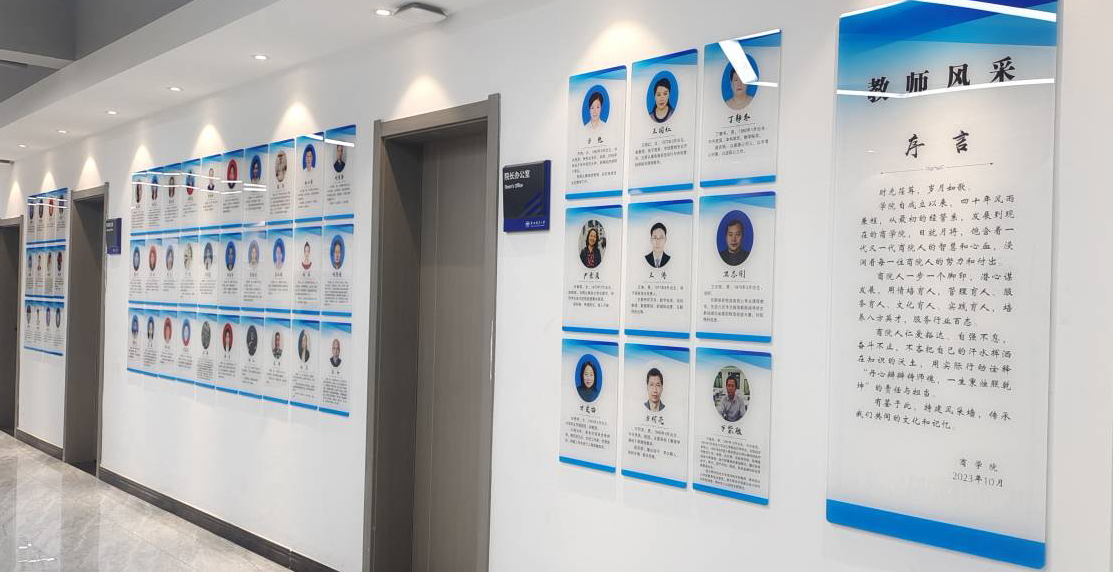 一直以来,学院十分重视文化建设,力争让每堵墙壁都说话,每个角落都育人。本学期学院党总支精心构思和设计,历时三个多月的共同努力,在商学院办公区的墙壁上,设计制作了商学院教师风采墙,致力打造阳光积极的商学院教师形象,为学院代言。