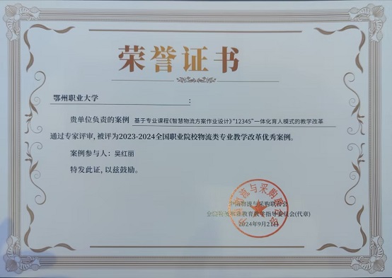 同时在会上由吴红丽老师负责的《智慧物流方案作业设计》课程“12345”一体化育人模式教学改革案例,荣获2023-2024全国职业院校物流类专业教学改革优秀案例奖。此案例是商学院现代物流管理专业在教学改革中的一次重要探索,通过“12345”一体化育人模式,全面提升了学生的专业素养和实践能力。吴红丽老师表示,获奖是对努力的最好回报,未来将继续深化教学改革,为物流行业培养更多优秀人才。