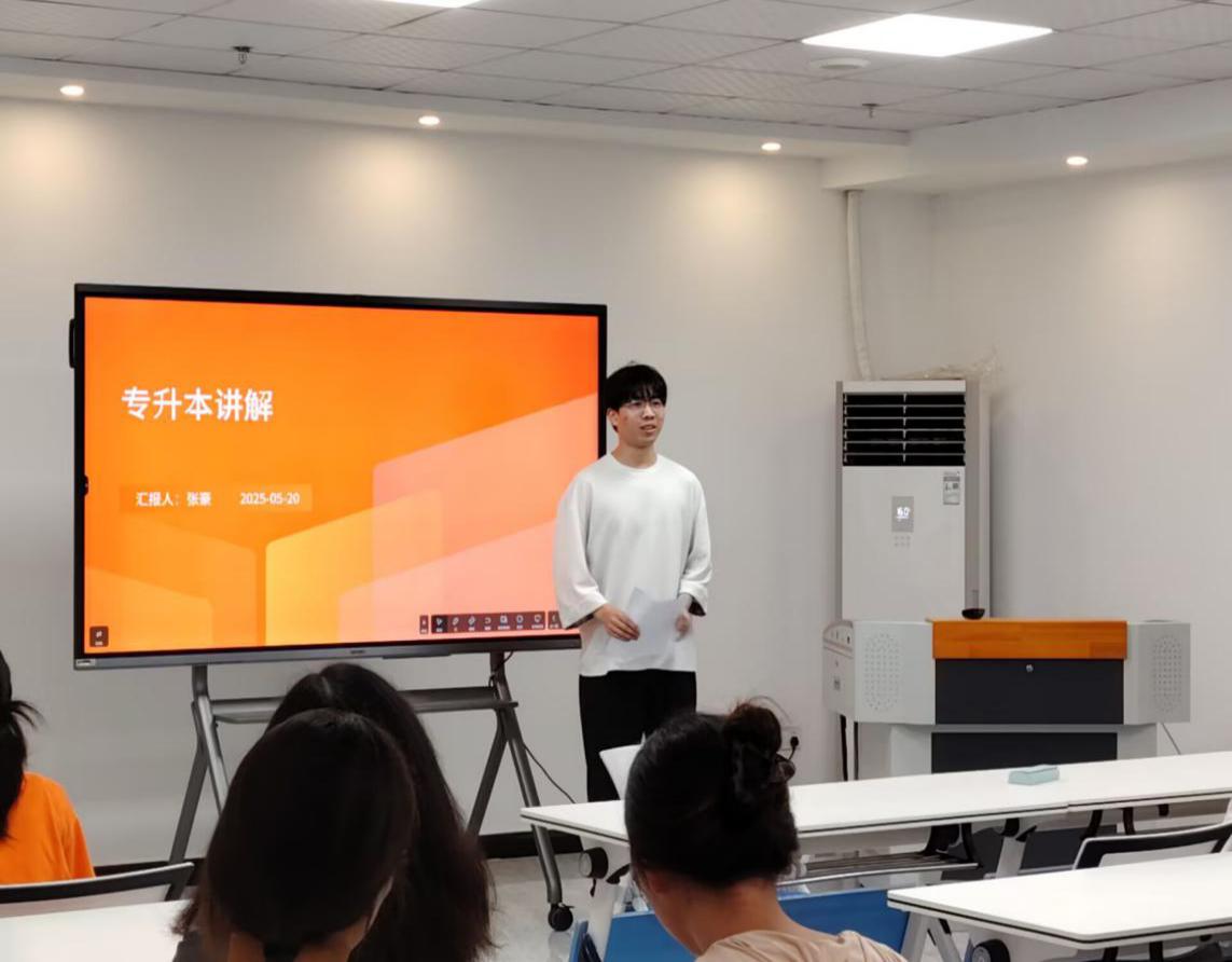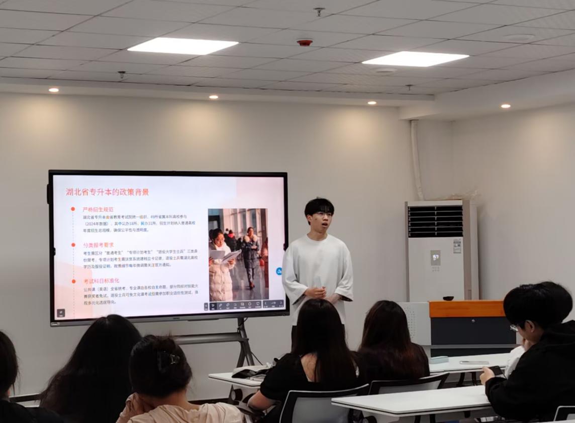 活动开场,2022级工商企业管理一班的张豪同学率先分享。2025年,他凭借优异表现免试专升本至湖北民族大学。大学期间,张豪不仅获得学校励志奖学金,还荣获优秀团干、三好学生等荣誉称号。在竞赛方面,他成绩斐然,斩获全国数智企业沙盘模拟比赛三等奖、湖北省数智企业沙盘模拟比赛一等奖以及创业之星国赛二等奖等。张豪从职业发展与技能提升的角度,详细分享了专升本备考策略与学习方法。结合自身经历,他指导同学们如何在大学期间科学规划时间、全面提升综合素质,并鼓励大家积极参与实践活动,增强自身竞争力。