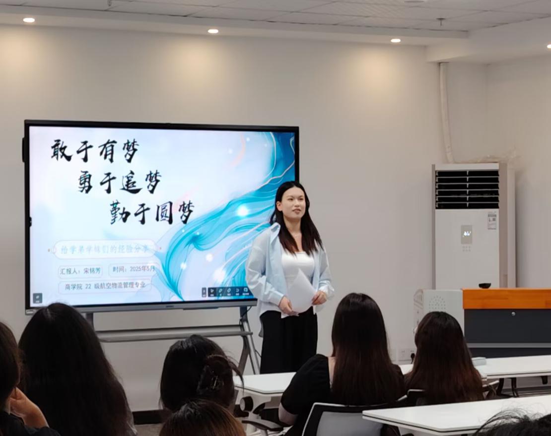 接着,2022级航空物流管理专业的宋铭芳同学带来分享。2024年,她免试专升本至湖北理工学院,在2023年和2024年分别获得国家励志奖学金和国家奖学金。2024年,她还在世界职业技能大赛中荣获铜奖。宋铭芳以自身经历为参照,为有升学意向的同学提供了极具价值的建议。她的分享内容详实、条理清晰,赢得同学们阵阵掌声。