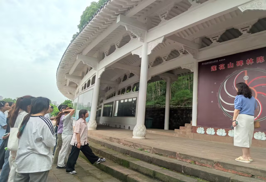 611日上午,商学院笱永莉、熊晓丽和吴红丽三位老师带领读书会学生前往莲花山碑林,开展了一场以“触摸文字艺术,传承儒家文化”为主题的研学活动。师生通过实地参观、互动交流,沉浸式感受碑林的历史底蕴与文化魅力。