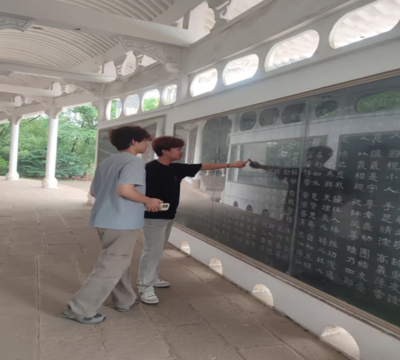 活动伊始,笱永莉老师结合碑林的历史脉络,详细讲解了碑刻艺术的演变过程及其承载的儒家文化内涵。从碑林的布局结构到代表性碑文的解读,笱老师通过生动的叙述,帮助学生理解文字艺术与儒家思想的深度融合。随后,学生们在老师带领下分组参观,通过拍照记录、互动提问等形式,进一步探索碑林的艺术细节。现场气氛活跃,学生们积极与老师探讨碑文中的哲学思想与历史故事,展现了浓厚的学习热情。