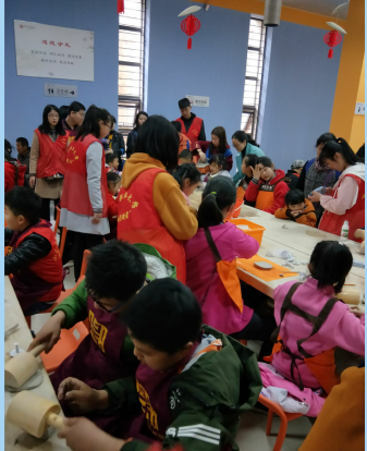 02级中职毕业的学生冯燕玲作为专业讲解员耐心细致地为孩子们和老人讲解馆藏文物的历史以及源远流长的楚文化。参观结束后,志愿者们又带领孩子们来到陶艺馆体验手工制陶,初次接触陶艺的孩子们既好奇又兴奋,大家一起揉、搓、捏、拉陶泥,充满了欢声笑语。