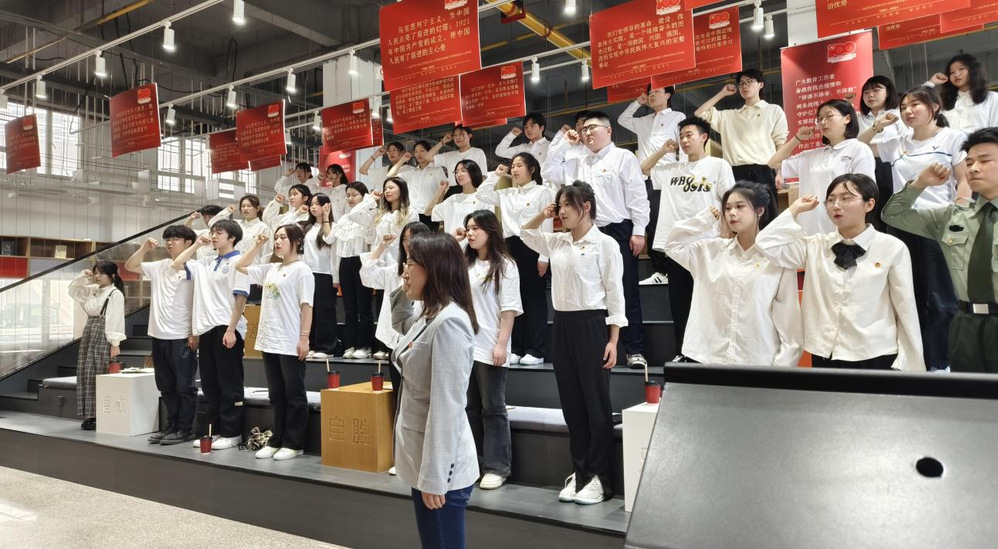 团日活动上,校团委副书记游潇带领全体参会人员重温入团誓词;团员代表吴小双、罗利果带领全体参会人员开展学习2024 年习近平总书记论坚持总体国家安全观以及《把握好“流量密码”,更要维护好国家安全》的文件。