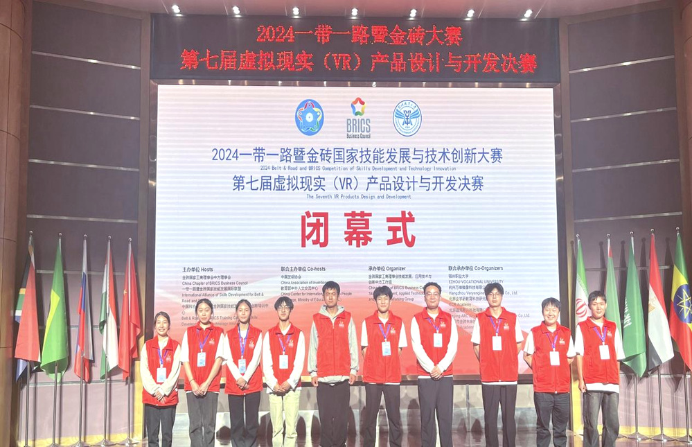 10月15日上午9时,《2024年“一带一路”暨金砖国家技能发展与技能创新大赛第七届虚拟现实(VR)产品设计与开发决赛》在鄂州职业大学五号楼学术报告厅圆满闭幕,并为参赛选手举行颁奖仪式,鄂州职业大学党委书记万国光宣布大赛闭幕。