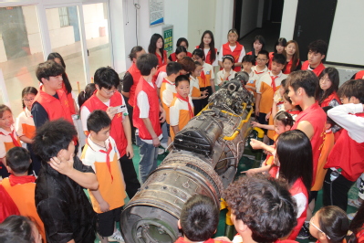 在航空工程学院师生的热情讲解下,小学生们分组参观了航空发动机展示区、模拟驾驶舱等实训区域。“这是飞机的‘心脏’,就像汽车的发动机一样重要……”志愿者们用生动易懂的语言,结合实物模型和互动演示,为孩子们讲解航空器构造、飞行原理等基础知识。模拟驾驶舱前,孩子们更是兴致勃勃,纷纷坐上驾驶位,在志愿者指导下“操控”按钮,沉浸式感受飞行员的工作场景,眼中满是对航空世界的好奇与向往。