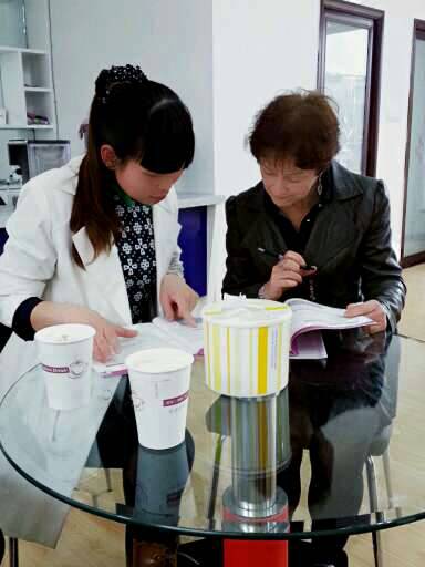 图为外籍教师Sonja和余荷花老师汇总选拔结果