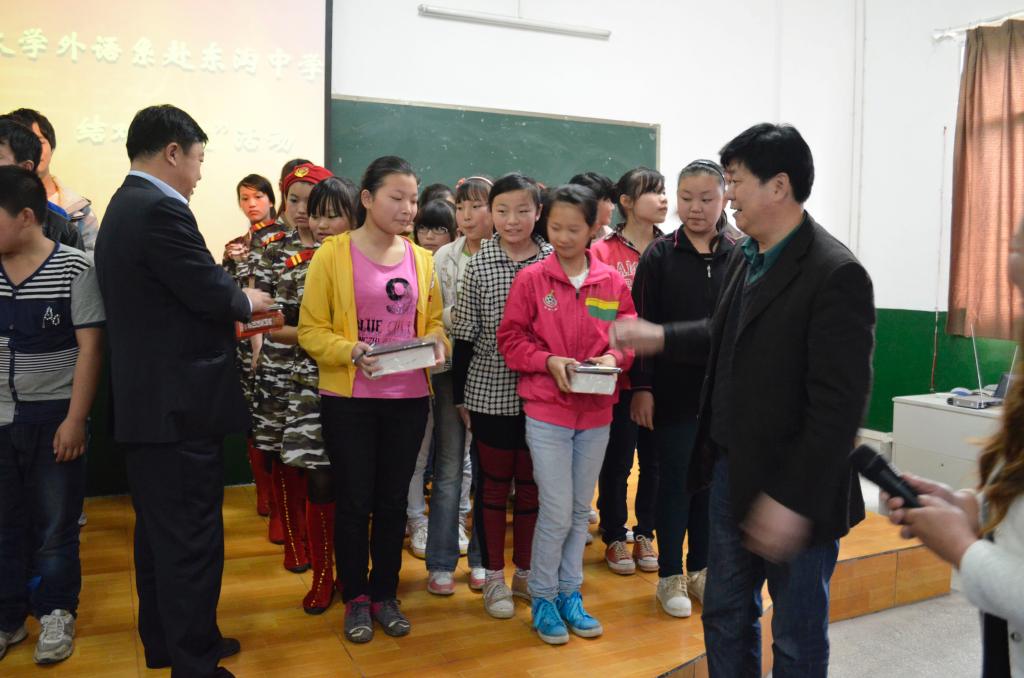 下课后,鄂州职业大学外语系师生和东沟中学的师生一起观看了一场别开生面的汇报演出。双方师生一起欣赏歌曲舞蹈,一起游戏互动,气氛热烈。表演结束后,外语系领导为东沟中学的42名留守儿童赠送了英汉辞典、文具、体育器材等一批教学物资。