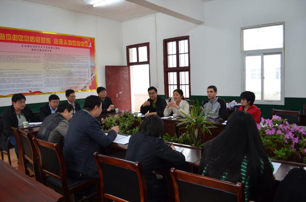 首先,外语系师生跟东沟中学的外语系老师们召开了一个座谈会,双方就如何在新形势下推进中学英语教学改革,培养学生学习英语的兴趣,提高词汇、语法记忆效率等方面的问题进行了深入讨论,外语系公共英语课程教研室主任陈霜梅、英语教育专业教研室杨培沛等老师结合教学实践经验,介绍了通过电影、唱歌和游戏互动等方法开展词汇、语法教学的技巧。东沟中学的老师们结合教师职业的岗位要求,对英语教育专业的人才培养方案、专业建设、课程体系建设和实践教学等方面的问题提出了很多建设性意见。