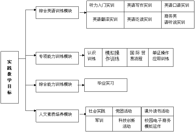 ①通过实践教学环节的设置,使毕业生具备基本的人文素质和相关领域活动能力,具有较强的国际贸易实践的基本技能,能完成国际贸易基本业务,具有娴熟的英语沟通能力、较强的商务英语运用能力、基本的经济学知识等基本知识和技能。