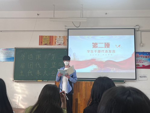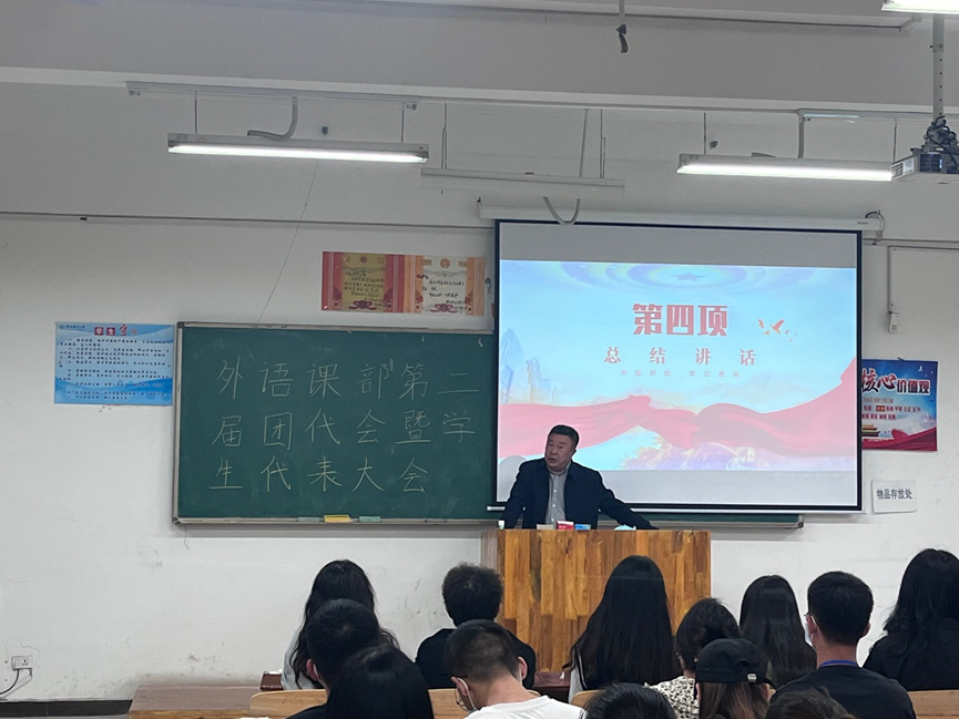 最后,外语课部主任刘真彪作总结发言。刘主任在讲话中充分肯定了上一届学生会成员对课部的付出,为今后新的学生会成员提出了更高的要求,并对外语课部学子提出了几点殷切期盼。同学们要始终坚持以习近平新时代中国特色社会主义思想为指引,深入学习贯彻党的二十大精神。要树立远大志向,努力学习,以严格的要求约束自己,做好榜样,带动同学们团结一心共同进步,成为更好的自己。