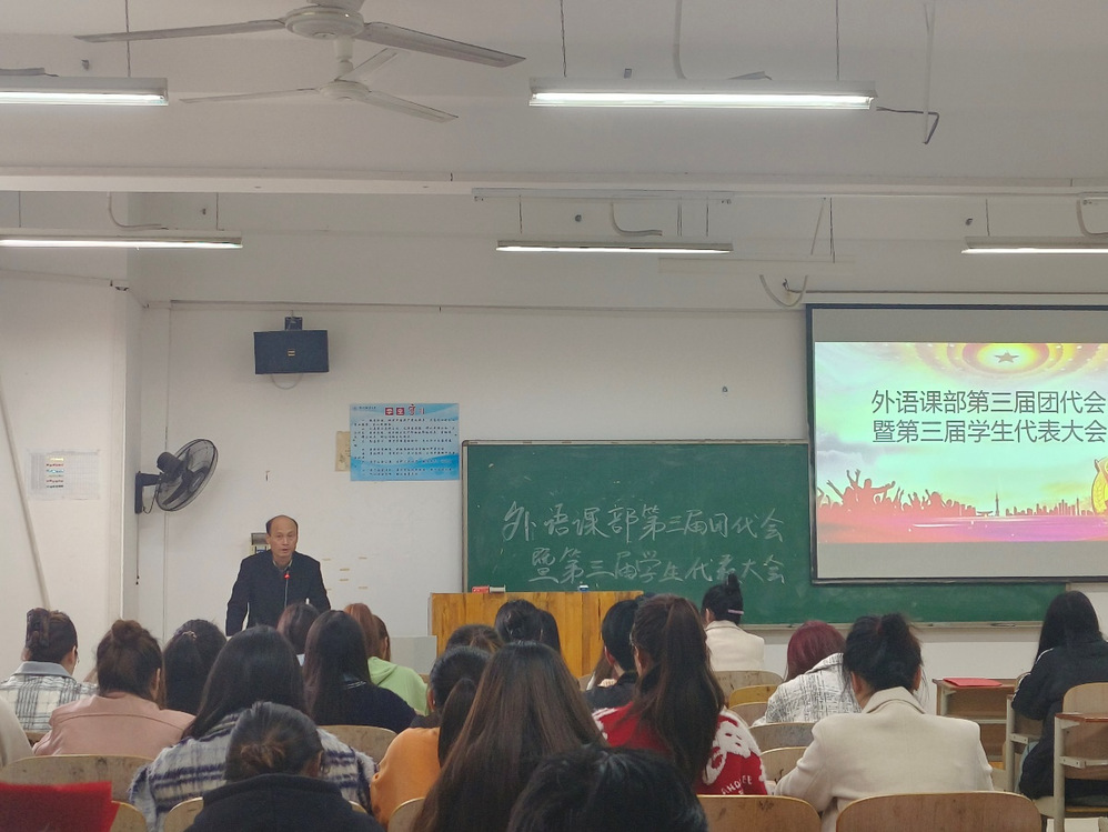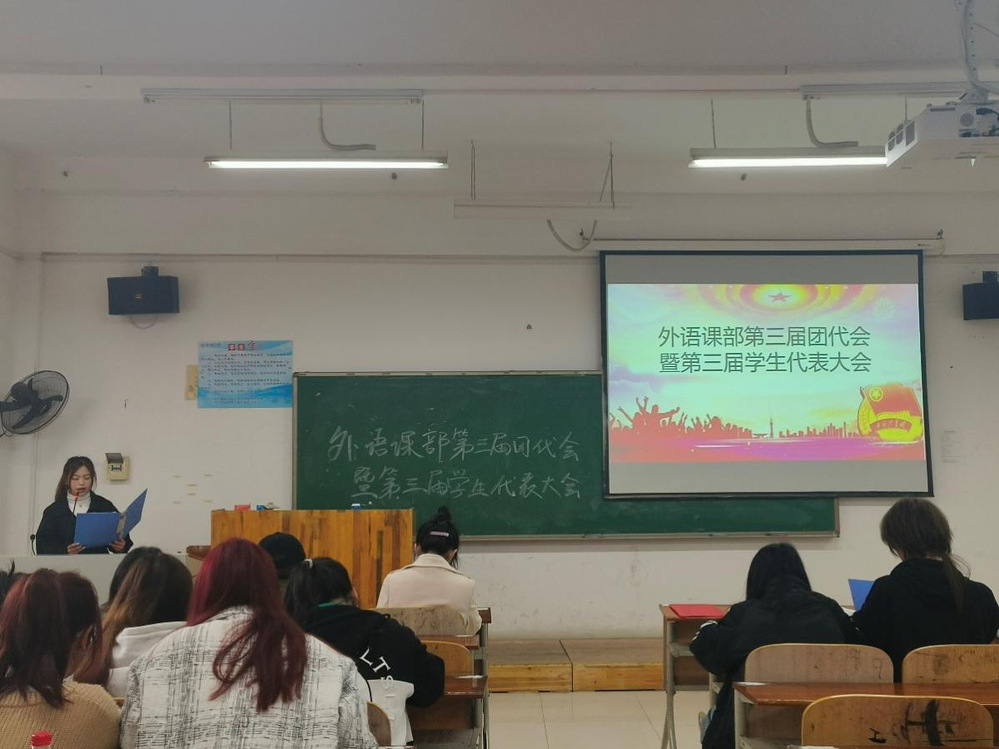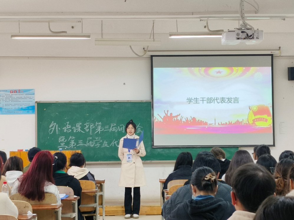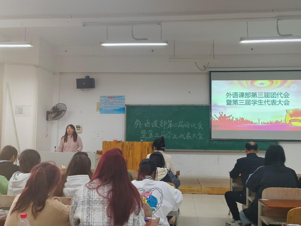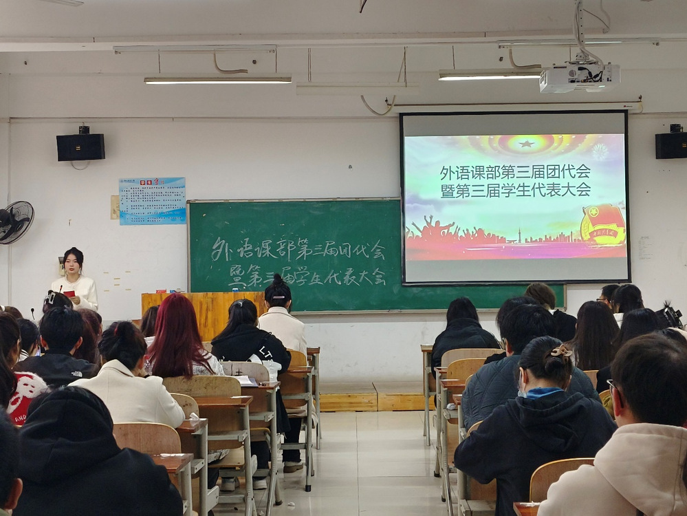2023年11月22日下午2:30,外语课部在五号楼E306教室隆重召开了第三届团员代表大会暨第三届学生代表大会。外语课部主任、书记潘宏友,副书记姜维,团总支书记朱怡清等课部领导及各年级团员代表、学生代表出席了大会。
