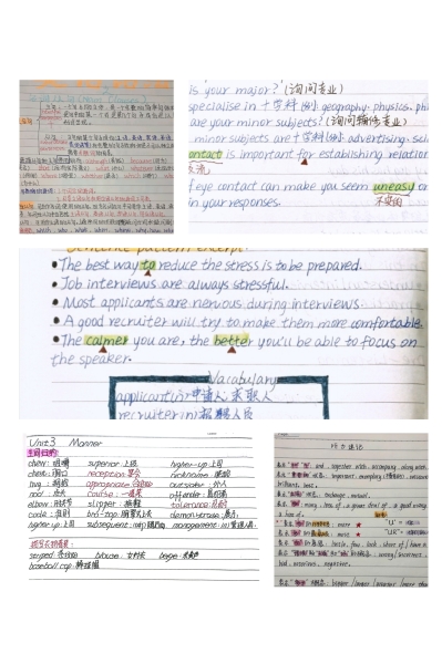 本次评选活动首先由班级推选出优秀作品,再进行课部评选。外语课部组织骨干教师仔细阅览,参照评分标准,认真评选每一份优秀作品。一份份精彩的笔记作品赢得了老师们的赞叹。笔记中的每一处落墨,撰写,批注,记载的是知识与记忆,刻画的都是奋斗的初心。