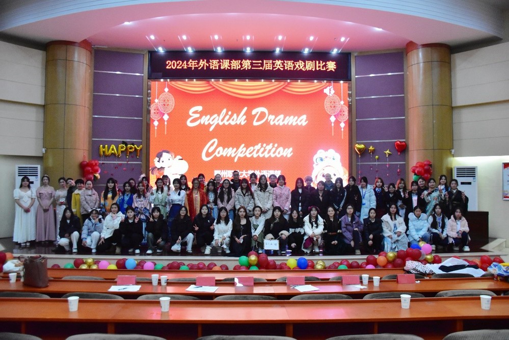 最后一个环节,全体话剧演员、领导、老师和工作人员有序地汇聚在舞台上,他们面带微笑,共同定格这一难忘的瞬间。相机快门声响起,记录下了这充满活力与欢乐的画面,也为本次英语话剧比赛画上了圆满的句号。
