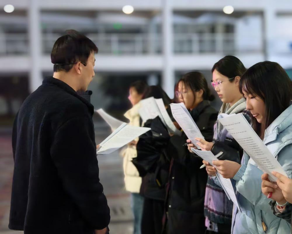 在直属党支部的统筹下,全体党员教师全程参与活动指导,将“立德树人”理念融入语言教学。活动为期10个教学周,每周一、周四晚6:20-6:55组织常态化诵读训练,通过语音知识、双语中华优秀文化、双语时政金句诵读、发音技巧指导,帮助学生提升语言感染力,提升文化自信与民族自信。