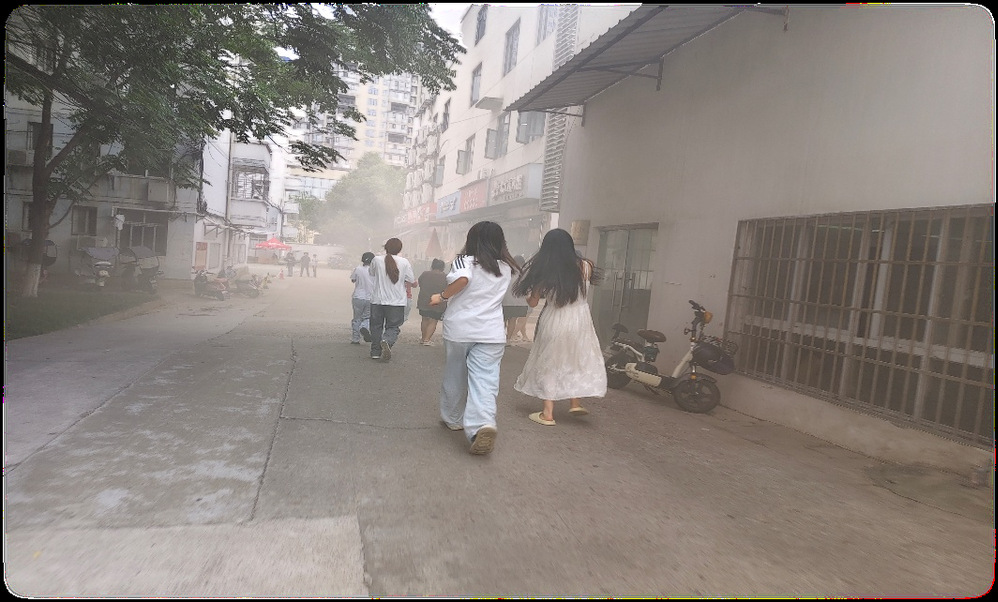 下午4点30分,演练正式启动。东三栋走廊模拟火情的橙色烟雾弹引燃,消防警报瞬间响起。各楼层安全员迅速就位,引导同学们按照既定路线和规范动作,用湿毛巾捂住口鼻,沿疏散标识低姿快速、有序撤离。
