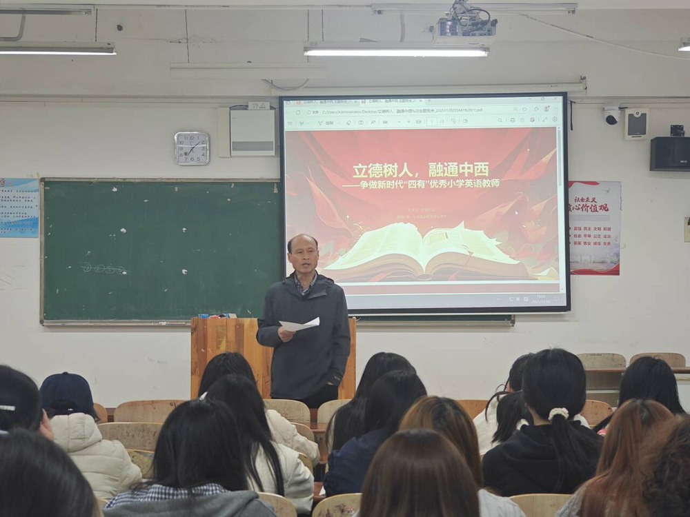 (通讯员朱怡清)2025年11月30日晚,东三栋“一站式”学生社区开展了支部书记讲思政课活动,外语课部直属支部书记潘宏友以“立德树人,融通中西——争做新时代‘四有’优秀小学英语教师”为题,为社区内的学生们带来了一场精彩且富有教育意义的思政课。
