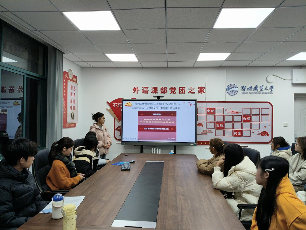 (本网讯)2025年12月9日,为深入学习贯彻党的二十届四中全会精神,引导广大团学青年深刻领会全会的重大意义、核心要义和实践要求,外语课部团总支依托东三栋“一站式”学生社区组织开展了学习贯彻党的二十届四中全会精神专题活动,采用了“集中学习+宣讲解读+内容拓展”的一体化模式,社区团干部、团员代表及学生代表参加了本次学习活动。