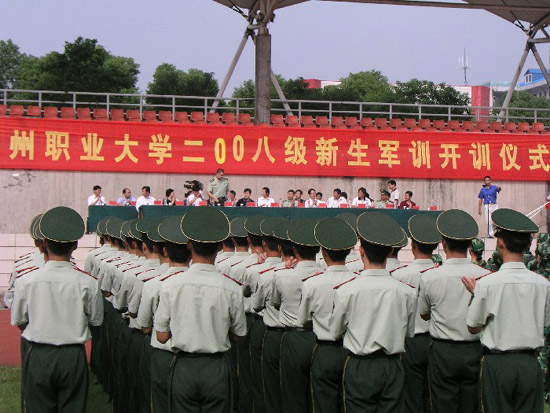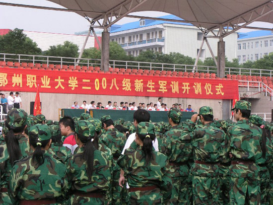 仪式由校长助理胡海平同志主持,在庄严的国歌声中开训仪式正式拉开了帷幕。副书记、副校长洪贞银同志作军训前的动员讲话,号召新生通过军训,提高政治素质,要求他们学习部队严明的纪律和优良的作风,训出风采,训出成绩,为三年大学生活打下基础。武警鄂州支队参谋长何峰、军训教官代表和学生代表张俊峰也分别进行了发言。随后,校长田巨平同志代表学校向武警支队教导大队大队长胡加统同志授鄂州职业大学新生军训团旗。最后,校长助理胡海平同志宣布鄂州职业大学2008级新生军训正式开始。