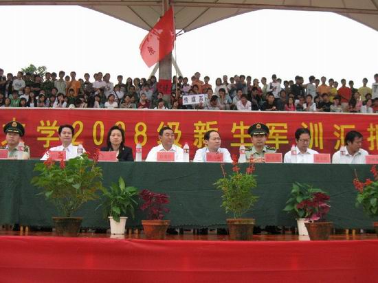 本次汇报表演由我校校长助理胡海平主持,在庄严的国歌声中汇报表演正式拉开了帷幕。鄂州市副市长李莹作表演前的讲话,代表市政府向08级新生表示慰问同时向圆满完成军训任务的全体新生表示祝贺。紧接着教官向校党委书记报告检阅仪式准备完毕,校党委书记彭有轩宣布开始检阅。精彩的阅兵式和分列式表演展现出08新生的全新的精神面貌,通过20天的军训,新同学们的精神面貌焕然一新,少了最初的骄气和稚气,多了当代大学生蓬勃向上的精神活力和勇往直前的无畏气概。同学们的表演获得出席领导和参加观看的老师和同学们的阵阵掌声。随后副校长童长江宣读表彰决定,表彰军训中的先进集体、优秀教官和优秀学员,校长田巨平向武警鄂州支队赠锦旗。最后,副书记副校长洪贞银讲话,洪贞银讲到教官们在军训中充分发扬了人民子弟兵的优良传统和作风,按照军训计划,精心组织,严格要求,以饱满的政治热情、严谨细致的工作作风、一往无前的军人品质影响并带动着同学们,确保了军事训练的圆满成功。在此,他代表学校向在军训中付出辛勤劳动的老师和教官表示衷心的感谢,向圆满完成军训任务的全体新生表示祝贺。洪校长还指出,军训过后,新生就要开始新的生活。希望同学们不忘父母嘱托,不辱历史使命,珍惜学习时光,把军训中学到的好思想、好精神、好作风融入到今后的学习和生活中去,在学习、生活乃至今后人生征程中续写新的辉煌篇章。