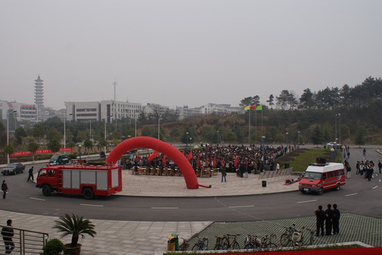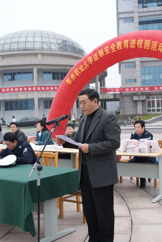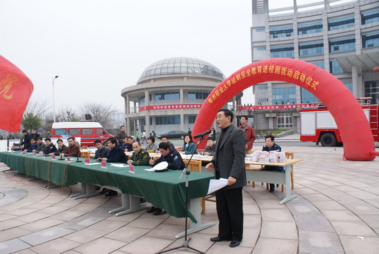 校党委副书记洪贞银主持仪式,凤凰街道办事处主任尹彬讲话。尹彬主任强调大学生应加强 “三防知识” 教育,希望同学们积极参与“防火、防偷、防骗”知识的学习。学生代表在仪式上也作了发言,表示将认真学习法制安全知识,树立法制安全意识。最后,校党委书记彭有轩号召全体师生积极行动起来,从小事和细节做起,共创和谐、平安校园,并宣布法制安全教育进校活动正式启动。