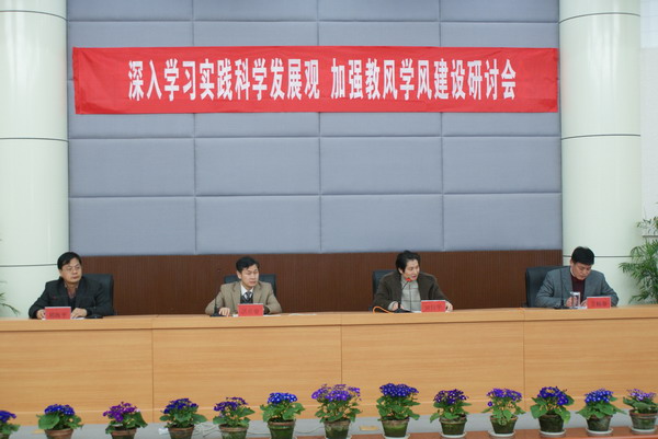 4月1日下午,我校在学术报告厅二楼会议室召开了“深入学习实践科学发展观,加强教风学风建设研讨会”,会议由校长田巨平主持,分管教学、学工的校领导和教务处、学工处、校办、人事处、工会、校报、网络中心主要负责人,学习实践科学发展观活动领导小组办公室宣传组和秘书组成员,学校专兼职督导员,各院系(部)副科级及以上干部、教研室主任、教授、博士、专职辅导员、班主任代表(1名)、学生会主席参加了此次会议。