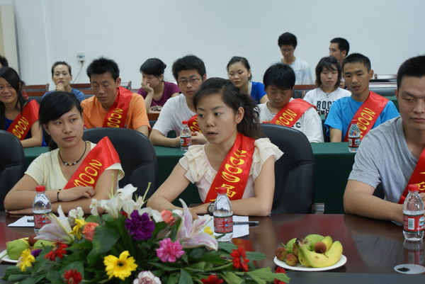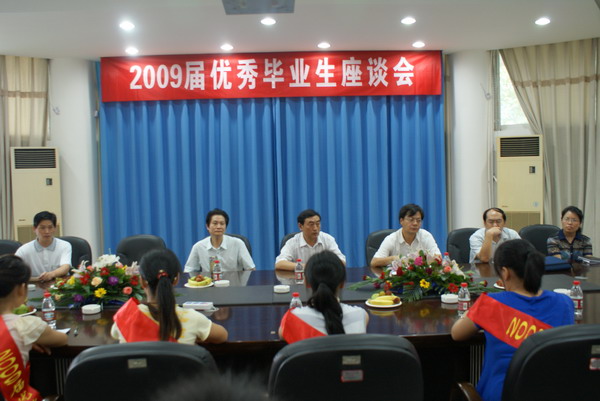 6月18日下午,校党委书记彭有轩、校长田巨平、校长助理胡海平一行在学术报告厅一楼会议室会见了2009届优秀毕业生代表,并就我校发展方向、教学改革、学生资助、学生管理等有关事宜与学生代表进行了亲切座谈。