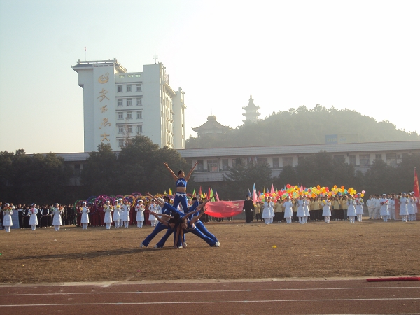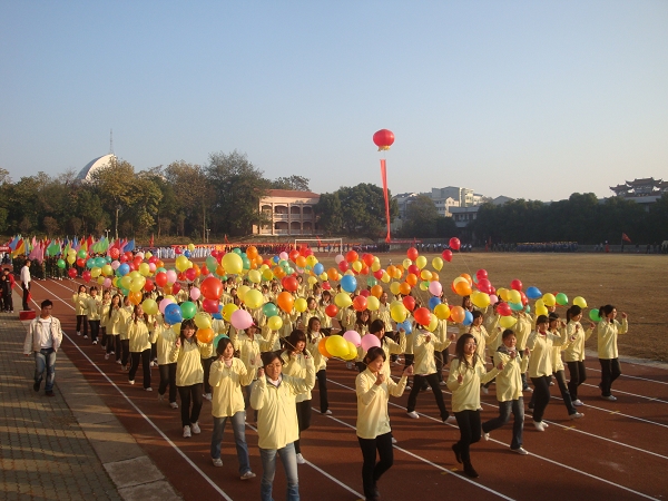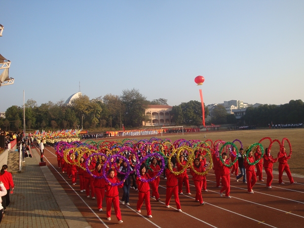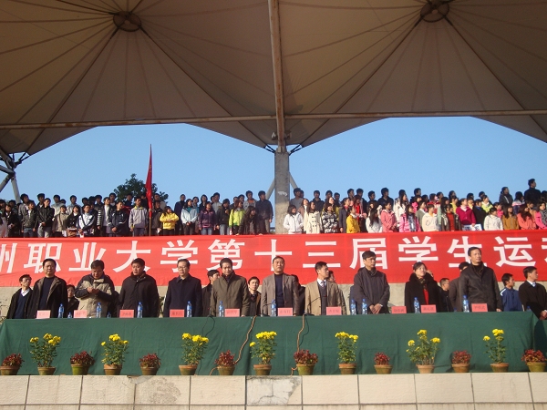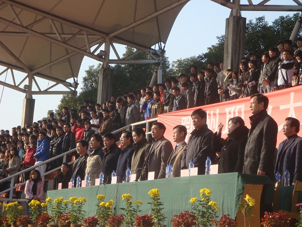 11月24日上午,我校1号体育场内彩旗飘扬、锣鼓喧天。值此举国欢庆建国六十周年,我校欢庆建校二十五周年创建示范高职的大好形势下,由教务处主办的振奋人心,开拓进取,和谐、团结、文明、奋进、育人的我校第十三届学生运动会(田径类)在此隆重开幕。校党委书记彭有轩,校长田巨平,校党委副书记、副校长洪贞银,副校长童长江、饶浩洲,校长助理卫杨春、蒋沁蓓、胡海平,校党委委员尹传武、夏清山等领导出席了开幕式。校学工处、校团委、校工会、校保卫处,各院系师生,各院系运动员代表队及今年新增的技工学校代表队共396运动员等参加了开幕式。