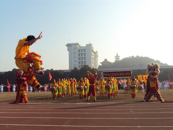 入场仪式上,各院系运动员代表方阵,花环方阵、彩旗方阵、彩球方阵等陆续入场,构成一道亮丽的风景线,跆拳道表演新奇而精彩;柔美而和谐的“健美操”表演展现了当代大学生的良好精神风貌;后勤集团的“威风锣鼓”表演异样精彩,“舞狮队”跳上主席台与校领导的亲切接触,表达良好祝愿,全场爆发雷鸣般掌声,把现场的气氛推向高潮。