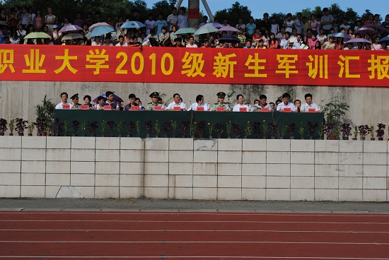 在学校各相关单位和院系的共同努力下,通过武警鄂州支队军训团全体教官的严格执教和管理,2010级新生军训工作已经按照计划和要求顺利完成。9月21日上午,我校2010级新生在一号教学区体育场举行了军训汇报表演,出席本次汇报表演的领导有:武警鄂州支队支队长刘再红、参谋长李俊喜、大队长童汨江;校党委书记彭有轩,校长田巨平,副书记副校长洪贞银,副校长童长江、饶浩洲,校长助理卫杨春、蒋沁蓓、胡海平;党委委员人事处处长尹传武、党办主任夏青山及学校各处室和各院系领导。
