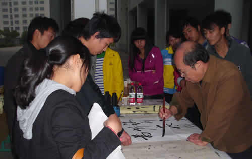 书法——中华文化的精髓.她是美的代名词。可在现代流行元素日益“猖獗”的今天,传统书法文化已经日益衰竭,特别是我们的软笔书法,更是今非昔比。为了丰富我校学生课余学习生活,弘扬中华民族优秀文化传统,丰富校园文化生活,让学生们亲身体验中国书法的“虚、静、明”的心境和中国古老的翰墨文化,在声色光影的时代更进一步地体验中国传统文化精髓的艺术魅力。2011年10月29日下午15:00,机械系书法协会于三号教学楼大厅内特别举办了一次书法艺术交流活动。机械系书法协会特邀了书法家徐年生老师前来莅临指导,每一位成员热烈的欢迎书法家徐年生老师的到来,彼此认识和了解之后,由徐老师亲自为各位成员指导,写字的技法并详细的讲解。协会的其他成员也挥毫泼墨,手把手指点学生写毛笔字。看得出教的普遍比较吃力,却一个比一个认真:“看,笔要这样握”、“这个字先写里面再写外面”……现场气氛十分轻松。每个在场的协会成员都能够感受到这似乎是在一个温馨的大家庭里,我们都是情同手足的兄弟姐妹。接下来,各位学生开始自己练习,他们写下自己喜欢的名言警句或者自己的名字。比如:“天行健,君子以自强不息。地势坤,君子以厚德载物。”等等,虽然他们书写得不够规范,但每一个字都倾注了他们的真诚与心血。活动的最后是由徐老师亲自为会员的作品进行点评。在活动即将结束的时候,徐老师还为表现比较突出的学生赠送书法作品,同协会的成员合影,记录下这次难忘的学习经历。