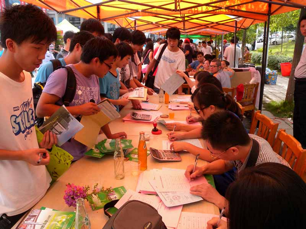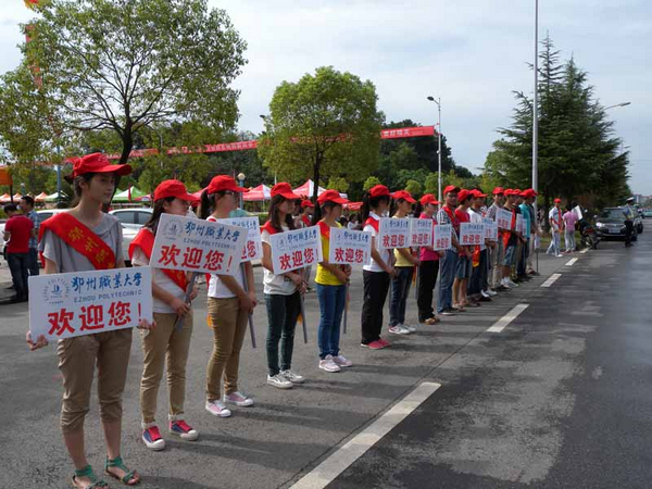 图书馆广场及校园内主要接待点外悬挂了喜庆的迎新横幅,巨型广告宣传栏和随处可见的指示牌对新生报到的流程进行了全面、详细的介绍和引导;各院系接待点,安排了数百名志愿者为新生们做向导、搬行李、领物品、找寝室……贴心关怀无处不在。