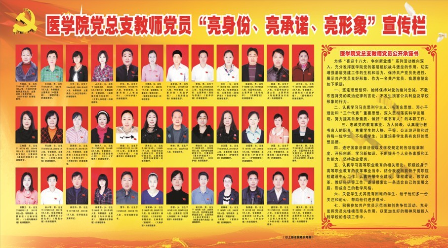 为深入学习贯彻十八大精神,医学院党总支以“总支创先进、岗位争先锋、党员争优秀”为目标,组织开展了党员“亮身份、亮承诺、亮形象”的活动。总支在党员活动室和学院的大厅内将党员的照片、岗位和公开承诺情况在宣传栏内公示,接受群众的监督。“三亮”活动的开展全面提升了医学院党组织和党员的良好形象,增强了学院为师生服务的意识,切实把党员的先进性要求公开化、岗位化、形象化,充分发挥了广大党员的先锋模范作用,激励广大党员群众为提升学校办学品质做出更大贡献。
