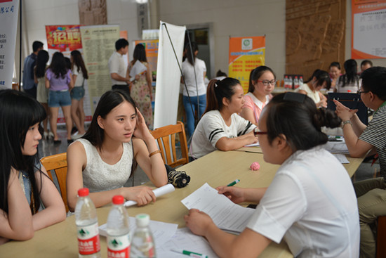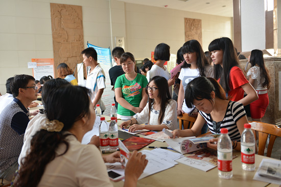 本网讯(学生记者陈敏、黎冬梅、缪小艳、王雅秋、李琴/文周楚明/摄)为服务学生就业,6月6日上午,我校在图书馆举行2014校园大型招聘会。前来招聘的125家企事业单位,主要来自武汉城市圈、长三角、珠三角经济区和东北、东南沿海城市,其中不乏世界500强、中国500强、世界行业100强企业等国有全资、中外合资、台资、外资企业或海外上市公司,提供医药、精工、电子、教育、金融、地产、服务等多个行业领域的岗位3800多个。