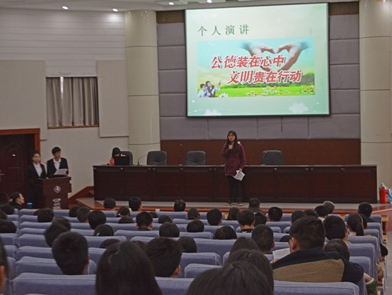 活动以丰富多彩的节目和竞赛开场,在欣赏了话剧表演、诗歌散文朗诵之后,文明礼仪知识抢答和演讲拉动了现场气氛。在场同学踊跃参加文明礼仪知识的抢答,选手们用饱满的热情、流利的语言、抑扬顿挫的声调及丰富的肢体动作,就文明礼仪的话题做了精彩的演说,获得了观众的阵阵掌声。
