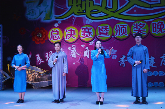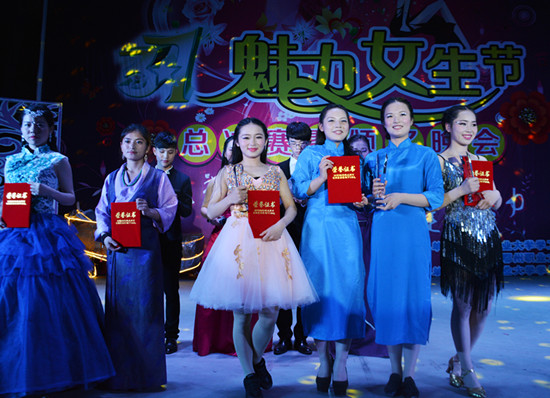 晚会上还颁发了女生节期间的活动——趣味运动会的团体赛名次,其中管理学院荣获趣味运动会团体第一名,机械工程学院和建筑工程学院并列第二,电子电气工程系、外语系和医学院并列第三。