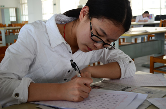 有的选手在比赛中从容淡定,有些选手则谨慎小心。14级建筑工程学院参赛选手陈梦真说:“平日练字写得很好,但参赛紧张导致手有点发抖,无法正常发挥,可见良好的心理素质有多么重要!”