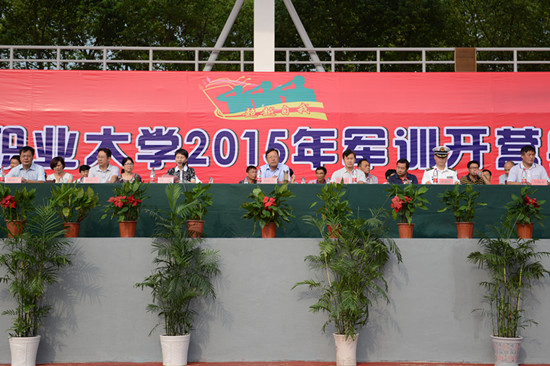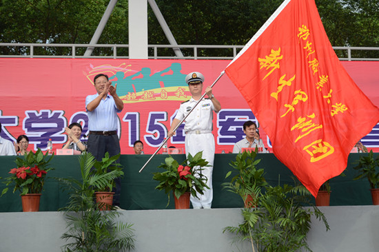 校党委书记杨植涛向新生军训团授旗,标志着为期13天的2015年新生军训正式开始。校长洪贞银在军训动员讲话中,要求大学生们不仅要志存高远、追求卓越,还要坚韧果敢、自强不息。军训是大学第一课,希望同学们能通过军训,提高品格,磨炼意志,强健体质,增强集体主义精神和组织纪律观念;并以敢吃苦、严要求的精神,力争取得优异的军训成绩。