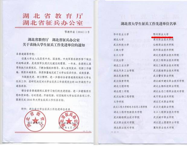 2016年4月14日,全省高校大学生征兵工作会议在湖北工业大学召开,我校在会上被湖北省教育厅、湖北省征兵办公室授予“湖北省大学生征兵工作先进单位”荣誉称号。