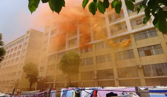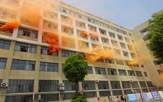 消防疏散演习在消防车警铃中拉开序幕,东十二栋女生公寓各楼层窗口瞬间冒出滚滚黄色浓烟,消防官兵及医学院领导老师、学生干部各就各位,互相协作,在短短的几分钟之内同学们在师生的组织下捂着毛巾一个接一个有条不紊地按指挥撤退到楼下空地。30分钟后,消防疏散演习完成了各项预定的动作圆满完成。
