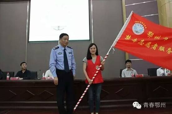 (市禁毒办主任孟昭茂为志愿服务队授旗)