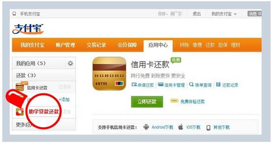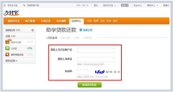 一、使用贷款时支付宝账户还款(适用知道支付宝密码、开通了网银的学生)