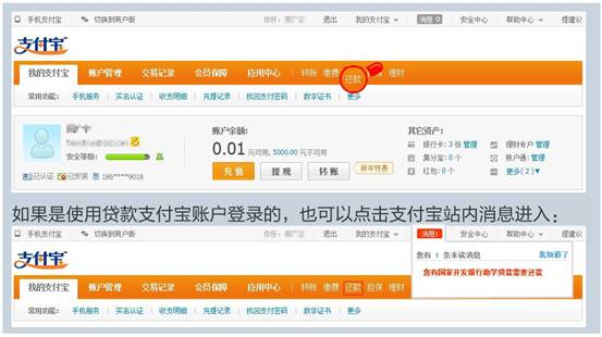 二、使用任一(含贷款支付宝)支付宝账户还款(适用忘记贷款支付宝密码、未开通网银的学生) 推荐方式