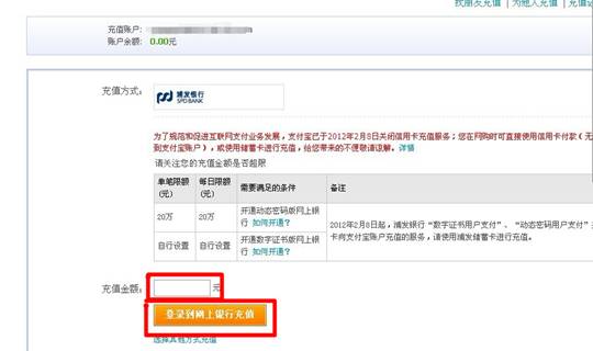 4、填写相应的充值金额,点击“登陆到网上银行充值”,系统会自动跳转到相应的网上登陆界面(每个银行的网上支付页面不同,请根据提示操作),利用网上银行充值成功后,支付宝会显示相应的账户余额。