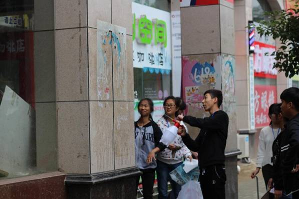 鄂大学生会全体学生干部按照预先的安排进行了分组、领取清除工具,由学工处吕俊吕老师亲自带队,以身作则,带着同学们对学校中轴线、二号楼、五号楼、学生宿舍、教工宿舍外墙小广告进行了全面清除。经过同学们的努力,大家齐心协力,誓与墙上的小广告奋战到底。平日乱贴的各类宣传小广告、招租招聘启事等,可谓极其顽固,同学们动用水瓶、小刀、小铲等工具与其展开激烈“斗争”。手撕、刀刮、喷水等各种方法轮番上阵。烈日炎炎,同学们汗流浃背,越干越带劲,经过一番战斗,终于把“牛皮癣”清理得干净彻底。