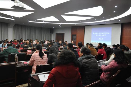 12月14日晚上七点,我校在学术报告厅一楼会议室举办第五期辅导员职业能力提升培训会议。各学院党总支副书记、团总支书记、专兼职辅导员;学工处、校团委全体人员参加了本次培训。校党委委员、副校长胡海平同志出席了本次培训会议。