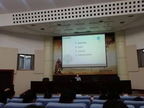 建设银行办公室副主任郑曦郑主任进行知识宣讲,郑主任主要从培养在校学生的金融诚信文化、推进青年学生信用体系建设、树立可持续发展的理财信念等进行了知识宣讲,进而要求学生增强风险意识和诚信意识,要严格对待校园贷现象,远离非法校园贷。