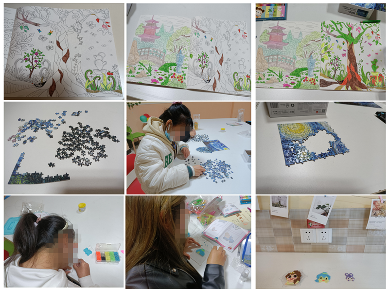 活动由心理健康教育中心来访同学自愿参加,可以选择的项目有涂色、拼图、制作小手工等等,每次参与的同学都继续之前同学未完成的作品,通过多人接力,合力完成一系列艺术作品。