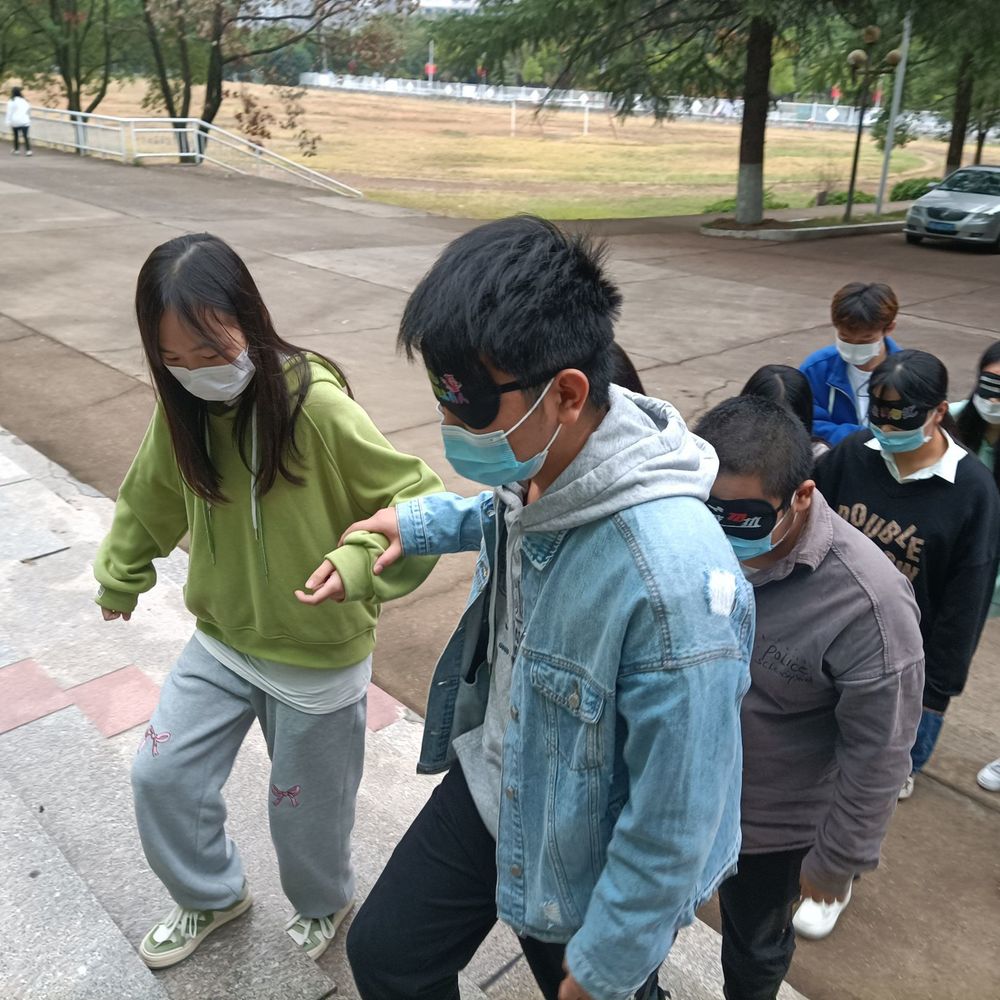 第三个活动是“盲人之旅”,大家轮流扮演盲人和拐杖,由“拐杖”保护“盲人”穿越障碍到达旅途终点,同学们在其中体验了看不见的感觉以及相互帮助和扶持。